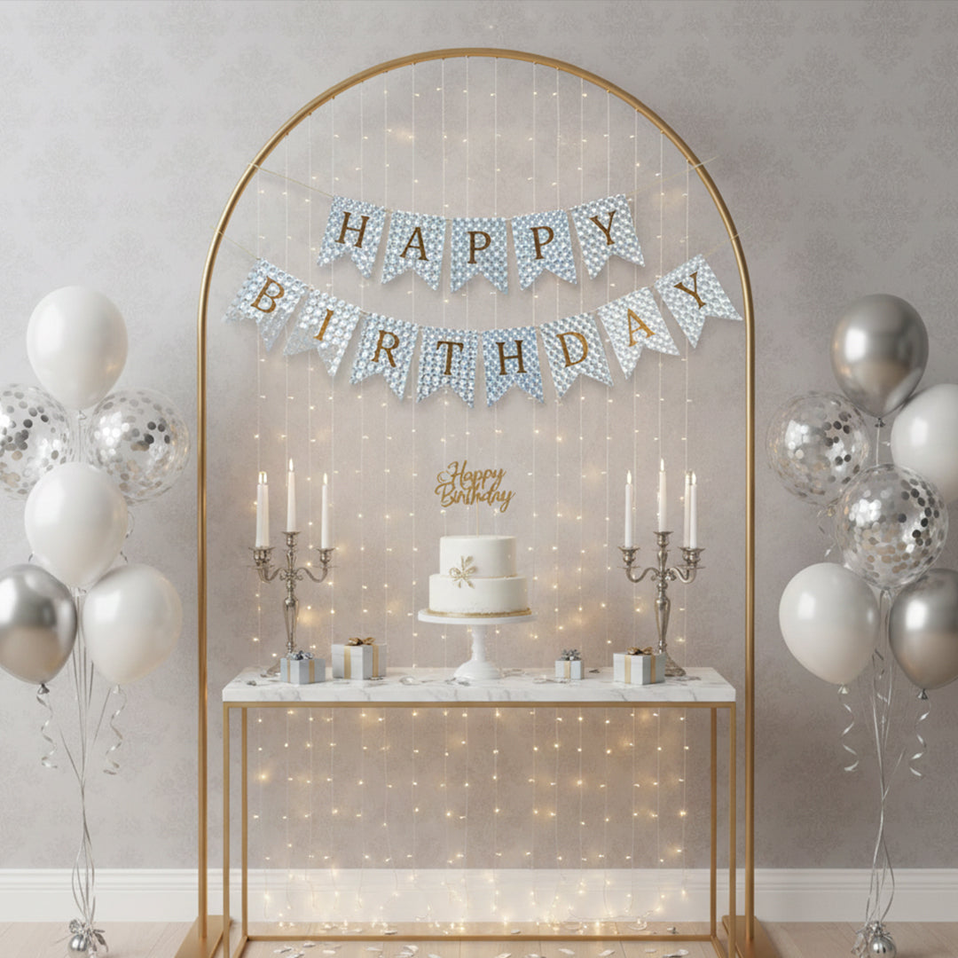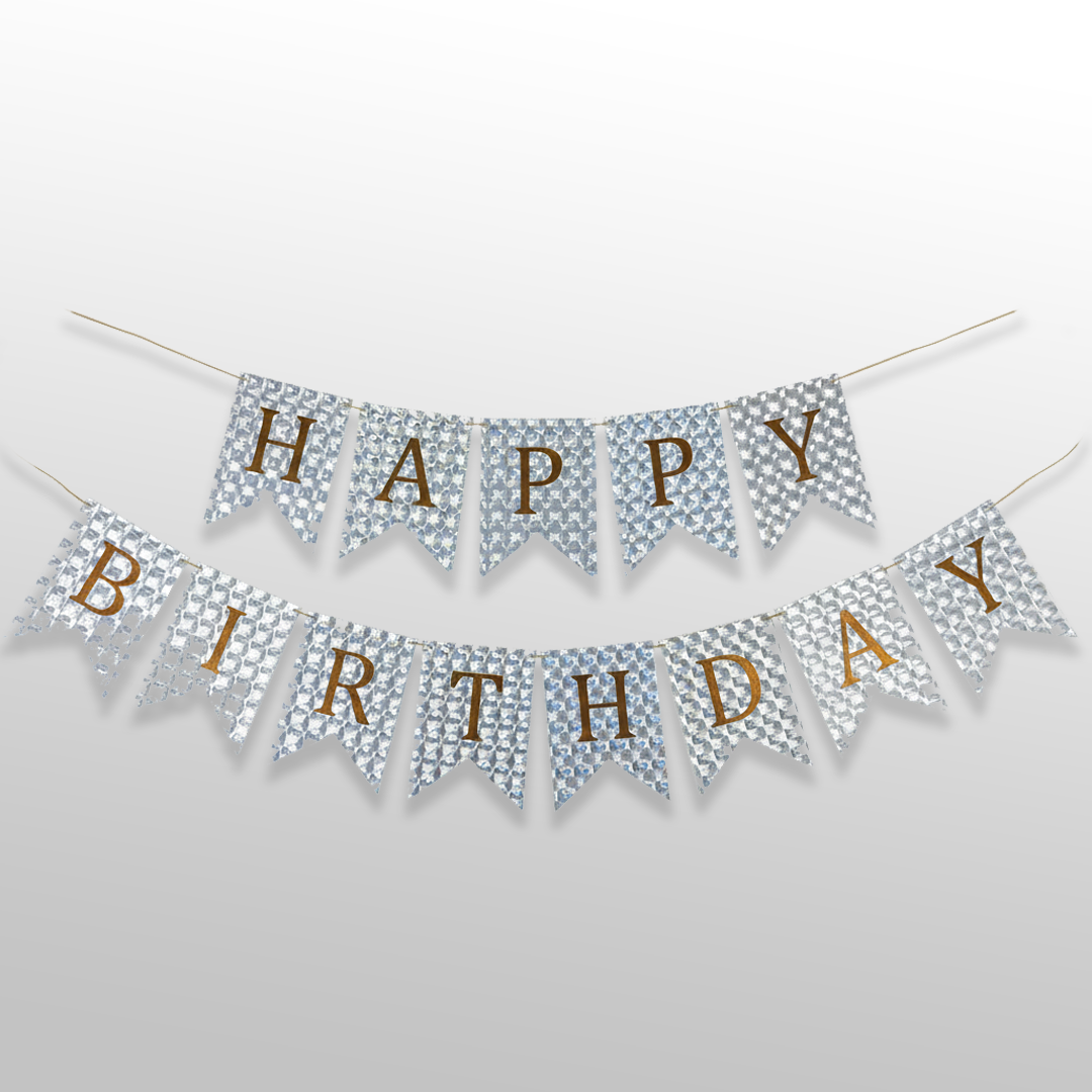 3D Bubbles Effect Silver and Golden Text Happy Birthday Shiny Bunting Flag Banner