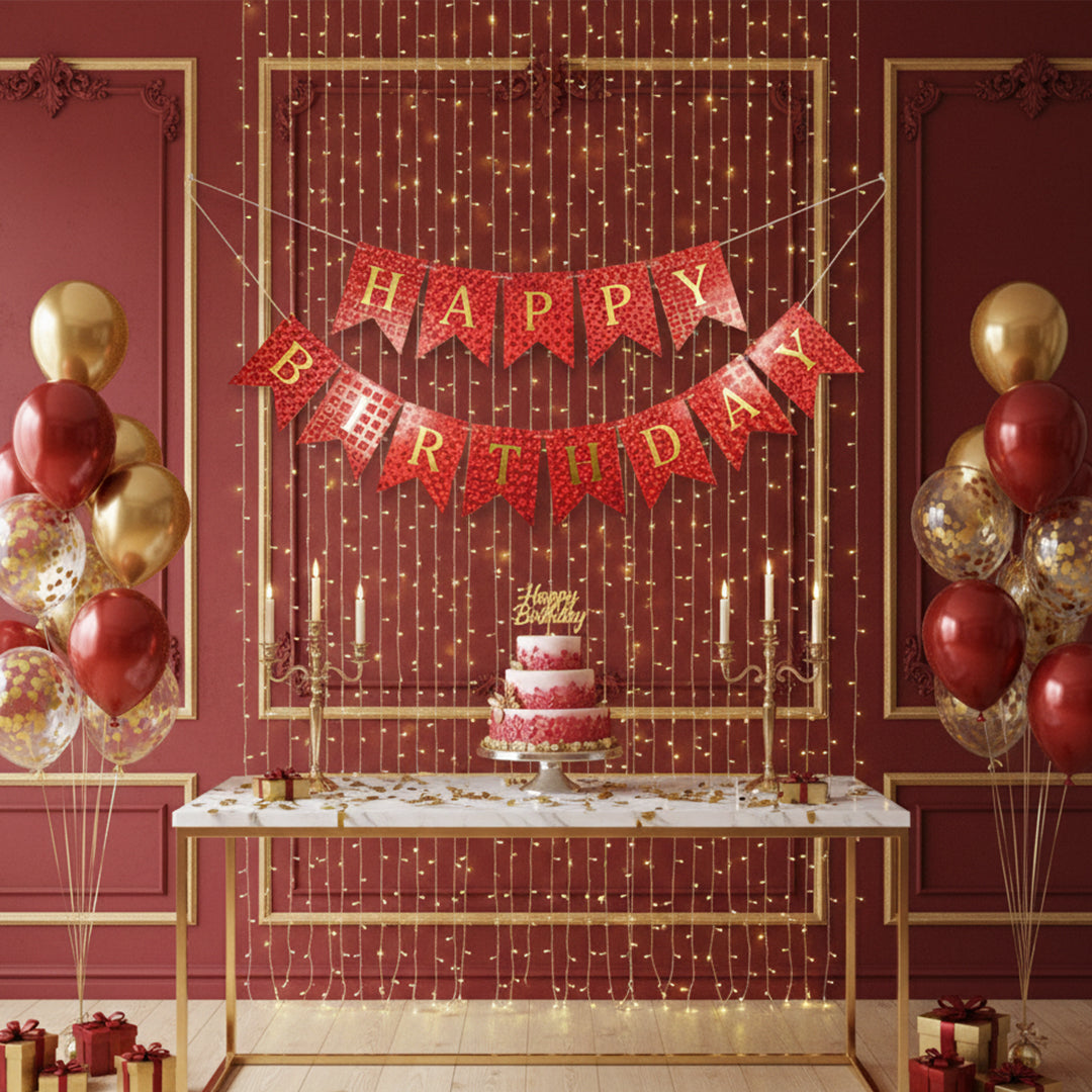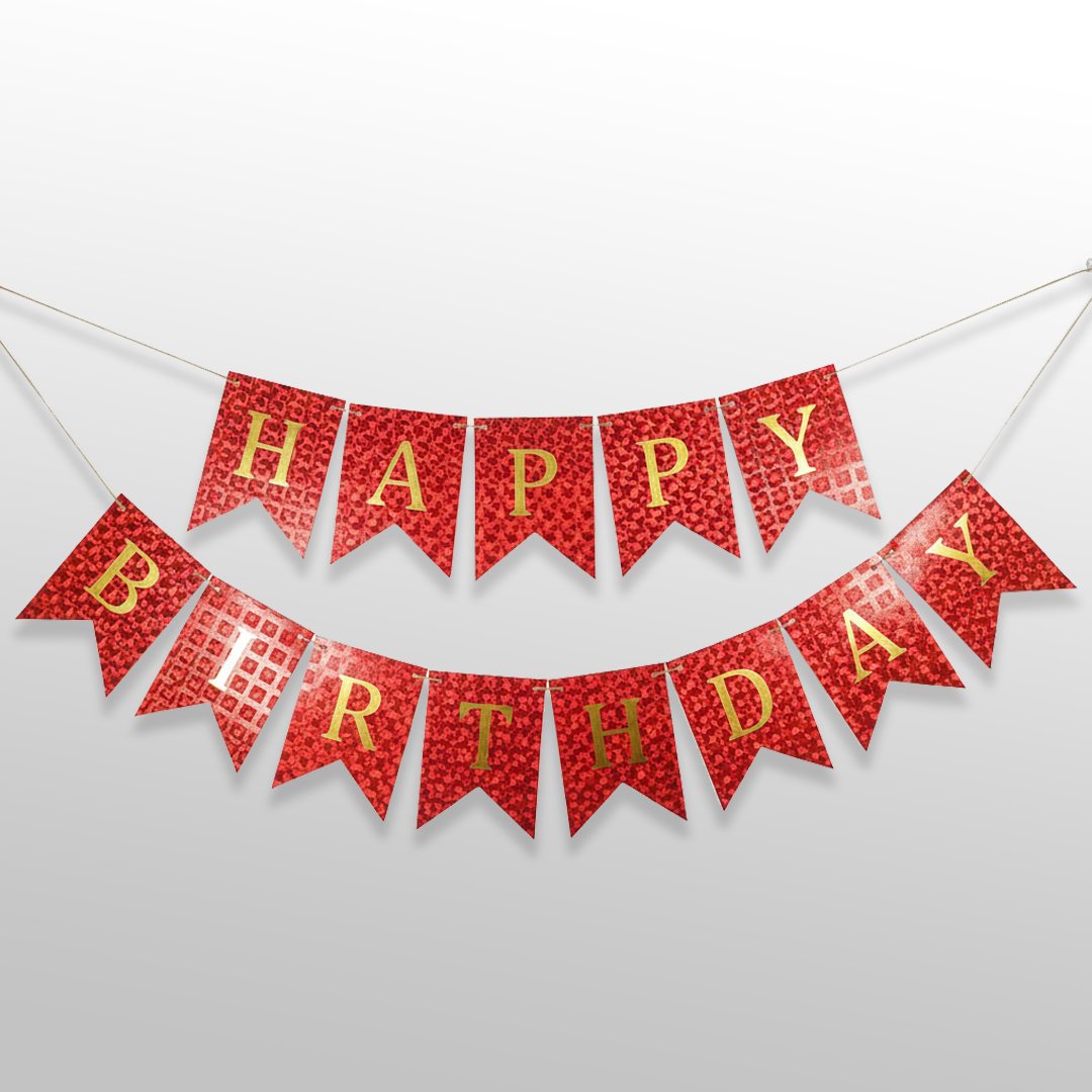 This 3D bubbles effect red and golden happy birthday bunting flag banner is designed to create a bold and vibrant birthday decoration setup. The rich red base combined with raised bubble detailing and shiny golden text adds depth, brightness, and festive charm. Its glossy finish enhances visual impact, making it ideal for backdrop decorations, wall décor, and photo-ready birthday celebration spaces.