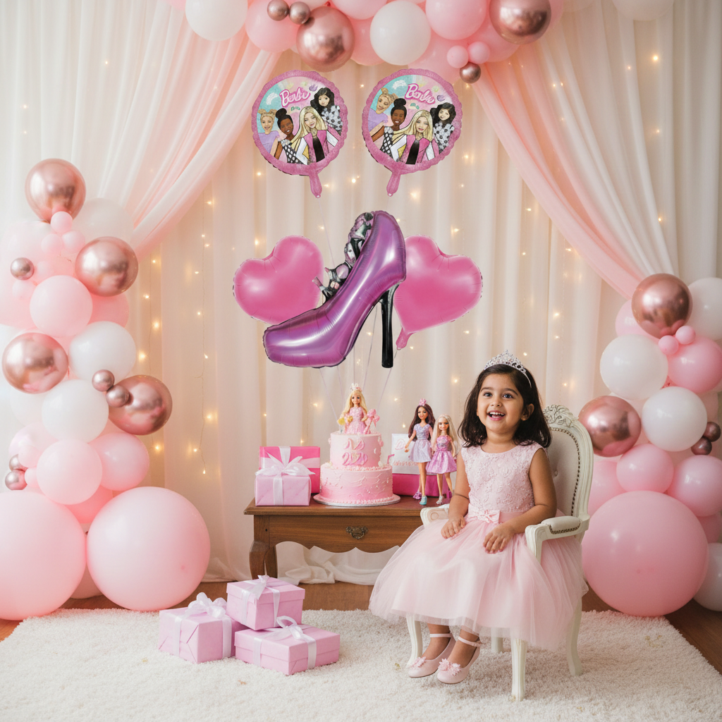 This Barbie shoe foil balloon set includes five stylish and playful balloons designed to add a fashionable and fun element to party décor. The shoe-inspired shapes and vibrant colors create a lively visual appeal, while the shiny foil surface enhances the overall presentation. Ideal for themed decorations, decorative clusters, and photo display areas.