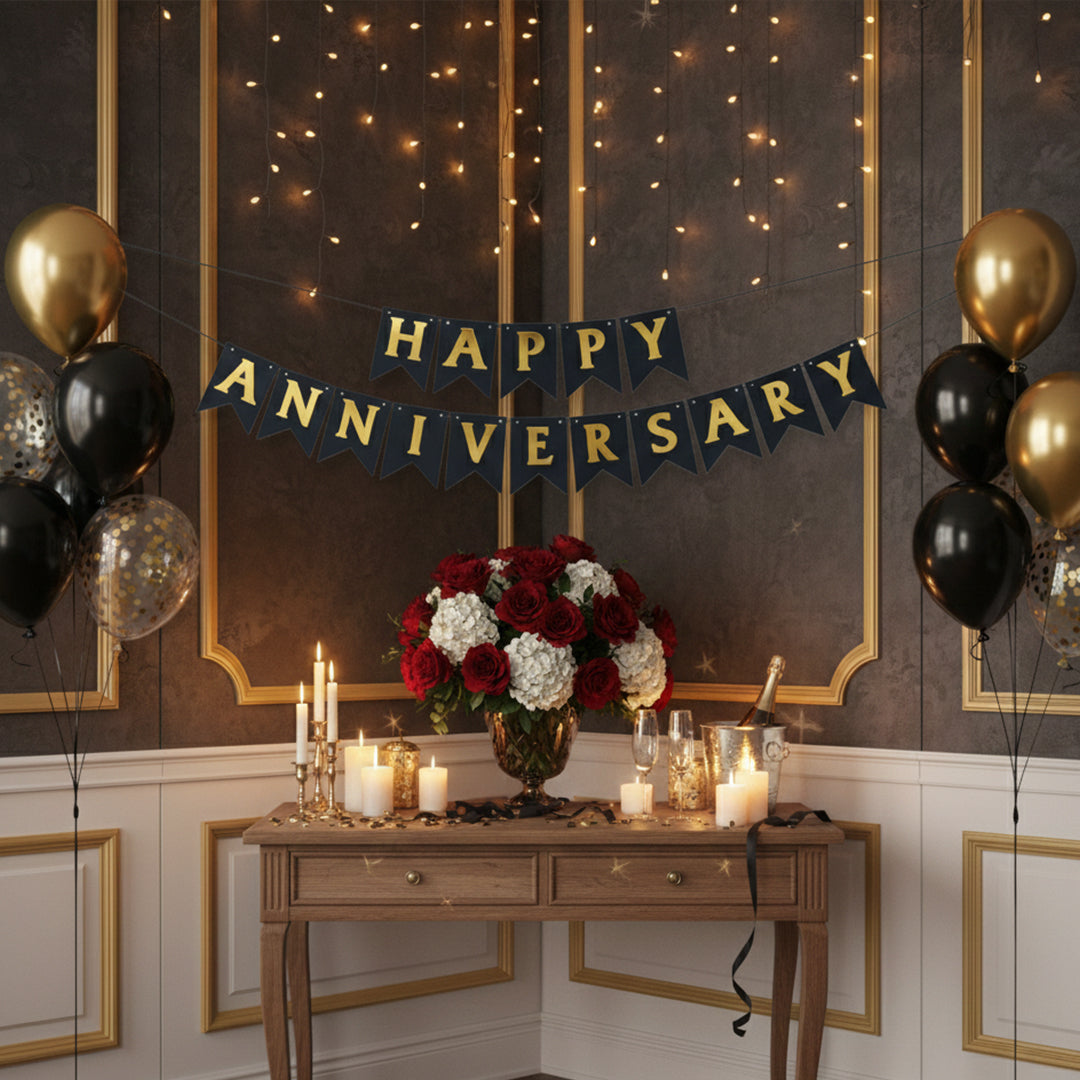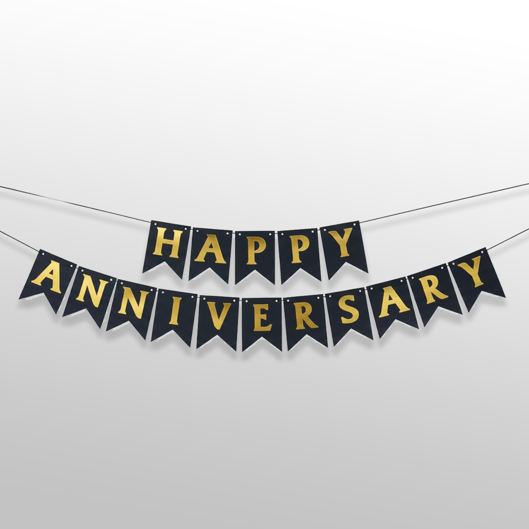 This black and golden happy anniversary bunting flag banner is designed to create a sophisticated and elegant celebration atmosphere. The bold black base paired with shiny golden text adds a premium and romantic feel. Perfect for anniversary backdrops, wall décor, and special celebration setups.