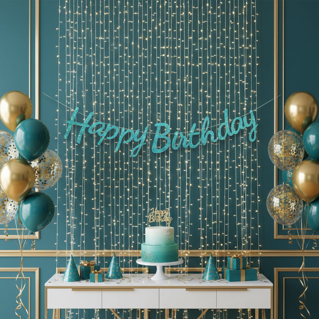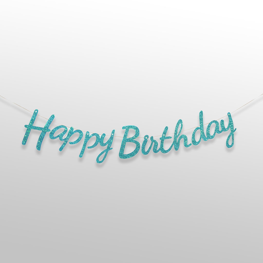 This blue cursive glitter happy birthday cutout banner offers a vibrant and elegant décor option for birthday celebrations. The rich blue tone combined with glitter detailing adds depth and shine. Perfect for decorating walls, backdrops, and party spaces.