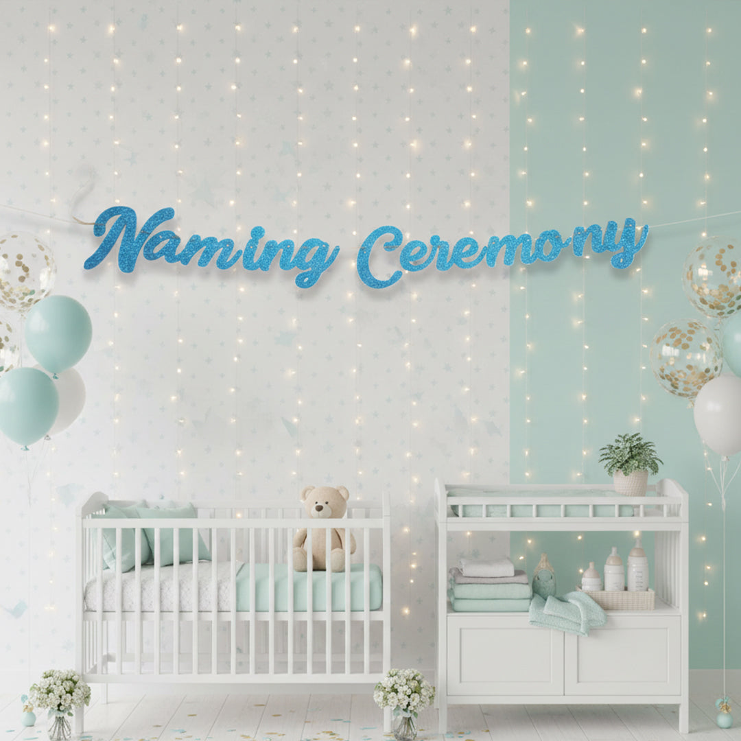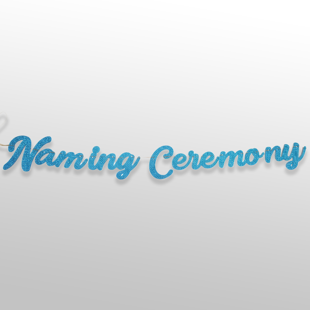 This blue cursive glitter naming ceremony cutout banner is designed to add elegance and charm to traditional naming ceremony décor. The cursive lettering paired with glitter detailing creates a refined and festive look. Ideal for decorating walls, ceremony backdrops, and photo areas while maintaining a graceful celebration atmosphere.