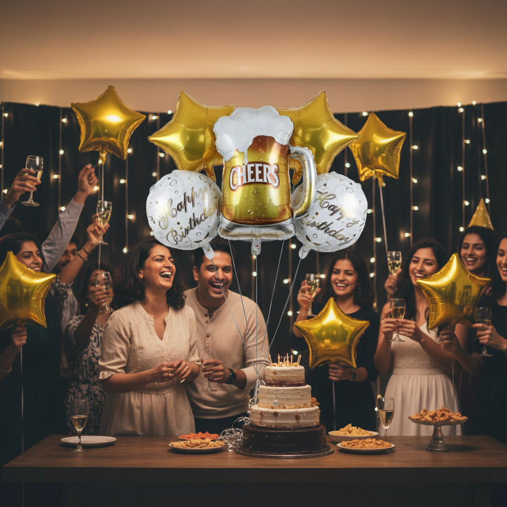 This “Cheers and Beers” themed foil balloon set includes five coordinated pieces designed to bring fun and energy to birthday celebrations and casual party setups. With bold graphics and a glossy finish, the set works perfectly for wall décor, backdrops, and party corners. The playful theme adds a lively atmosphere and makes the décor stand out in photos and videos.