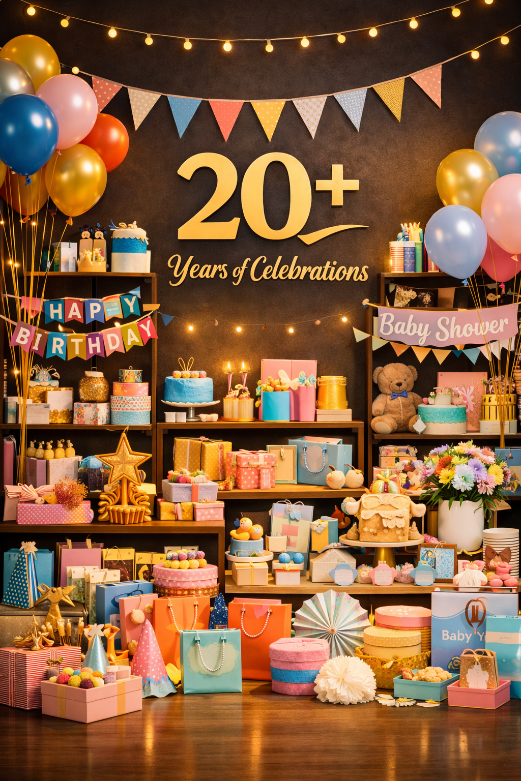What started as a small initiative driven by a love for celebrations has evolved into a brand trusted by thousands of customers. Over the past two decades, we have continuously expanded our range, improved quality standards, and adapted to changing celebration trends—while staying true to one simple goal: making celebrations easy and memorable.