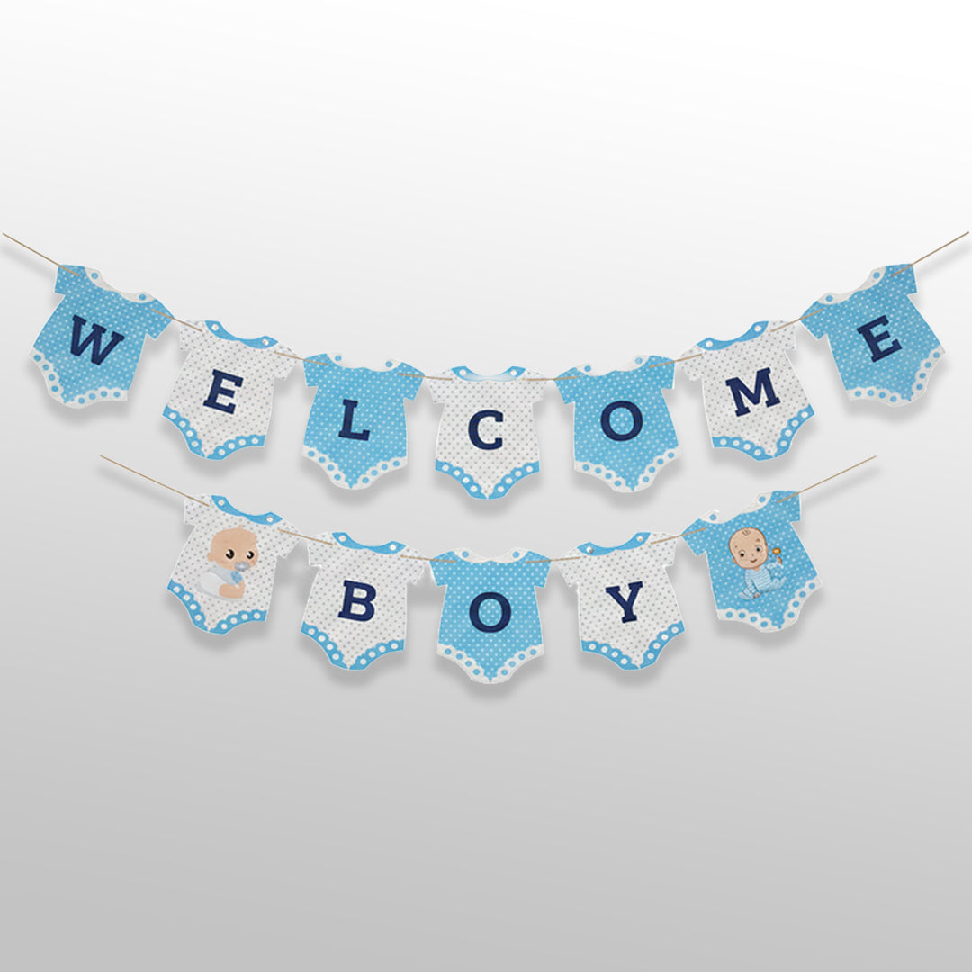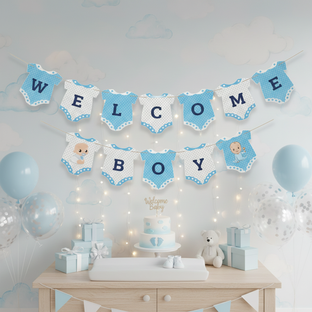 This welcome baby boy card bunting banner in blue is designed to create a cheerful and heartwarming decoration for welcoming a newborn. The soft blue color paired with card-style bunting adds a charming and celebratory feel to the décor. Its clean finish makes it ideal for wall décor, backdrop arrangements, and photo-ready welcome baby setups.